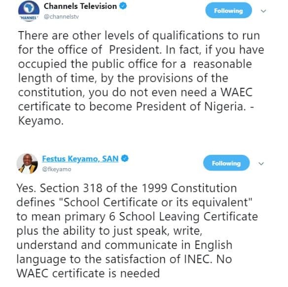 Spokesperson of the 2019 Buhari campaign organization, Festus Keyamo, was a guest on Channels TV last night where the issue of President Buhari’s WAEC certificate was discussed.