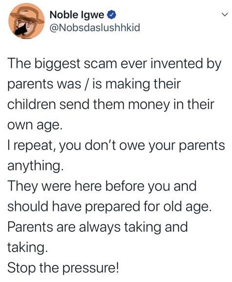 Noble opined that Parents should stop using their children as a retirement plan as the pressure is becoming too much.