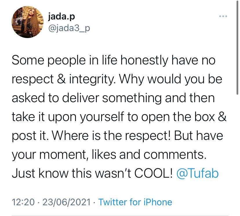 “Some people in life honestly have no respect & integrity. Why would you be asked to deliver something and then take it upon yourself to open the box & post it. Where is the respect! But have your moment, likes and comments. Just know this wasn’t COOL! @Tufab”.