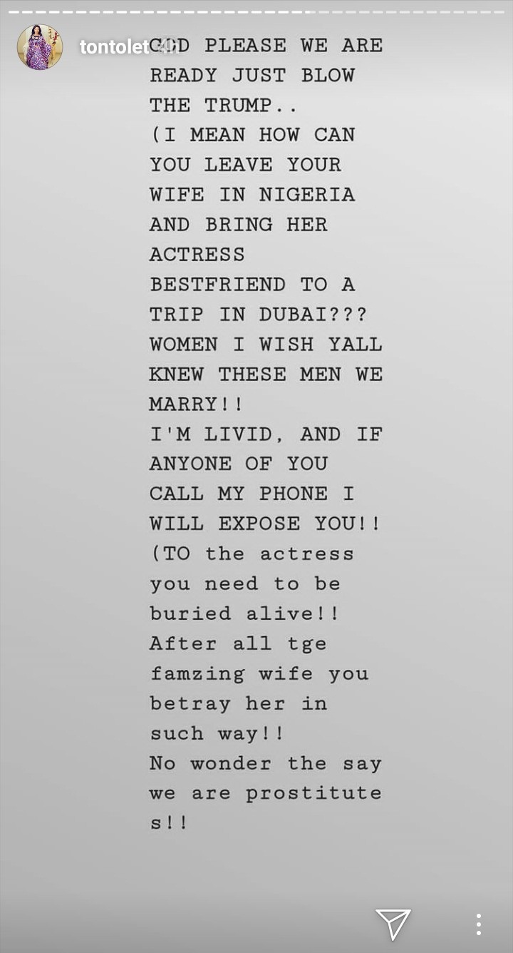 Nollywood Diva, Tonto Dikeh has called out a man and his mistress – an actress – for travelling to Dubai to enjoy while the man’s wife is in Nigeria.