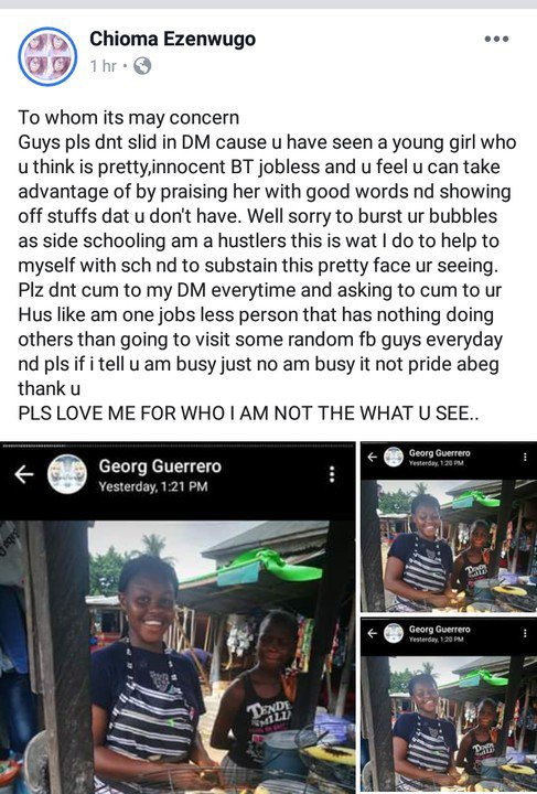 A cute Nigerian lady identified as Chioma Ezenwugo has given a stern warning to guys to stop sliding into her DM on Facebook to ask her out.