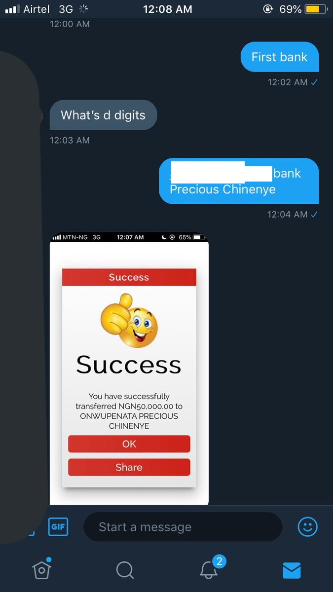 The lady identified as Precious, shared screenshots from her DM as she wrote ;