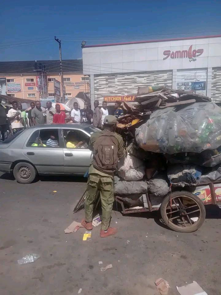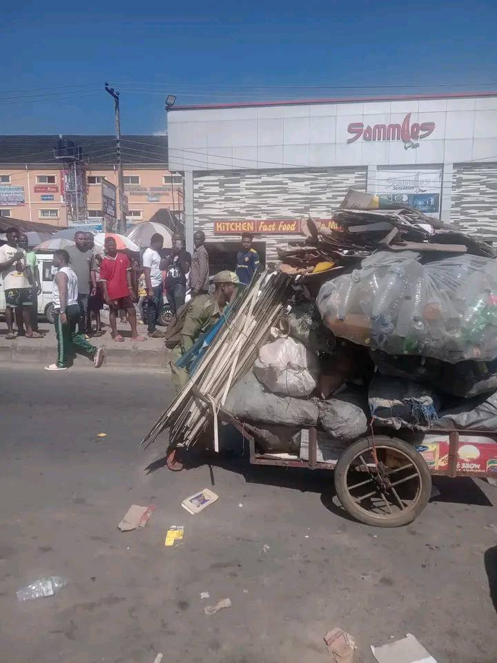 In the pictures reportedly taken at Choba Junction in Port Harcourt, Rivers State, and shared on Facebook by UNIPORT CCTV, the man is seen pushing a truck loaded with plastic bottles.