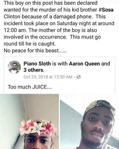 According to reports on social media, Sosa Clinton was killed last Saturday night, at around 12:00am – he reportedly damaged his phone and was punished by his mother and brothers. He died in the process.