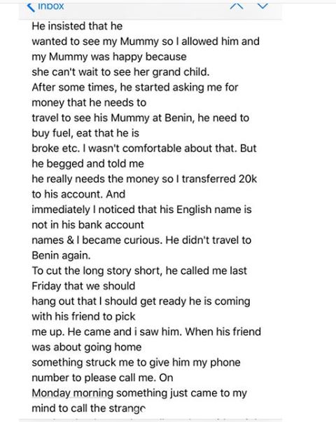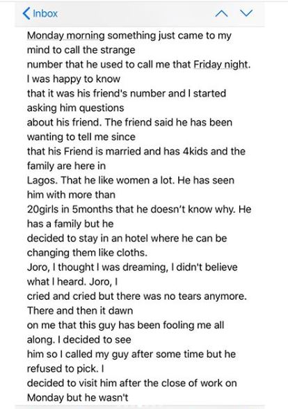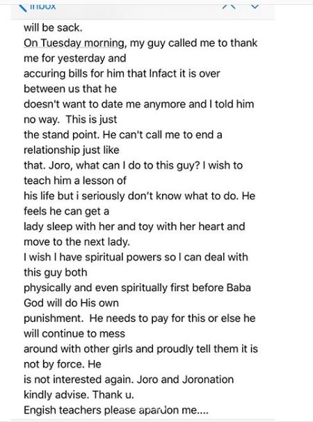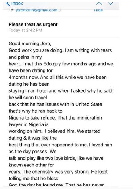 Nigerian relationship adviser and psychologist, Joro Olumofin shared the story of the young girl who fell into the hands of a player from Edo State who kept scamming and lying to her.