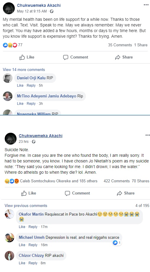 Chukwuemeka Akachi was suffering depression and spoke about it on a Facebook post hours before he committed he act. Sadly, the post barely got any reaction as people thought he was simply seeking attention.
