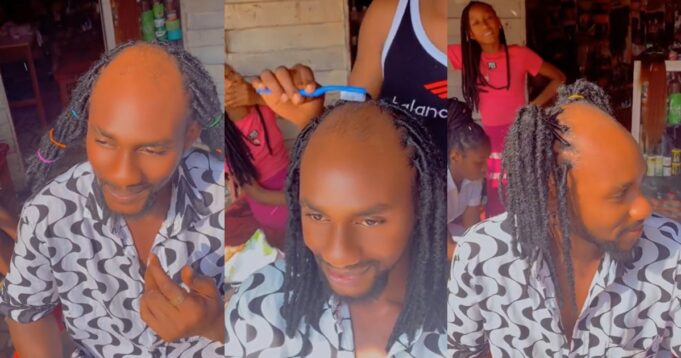 The viral clip recorded the hairstylist threading the hair of her male client, who is partly bald. The lady further adorned the hair with colourful hair bands before applying hair wax to his bald spot.