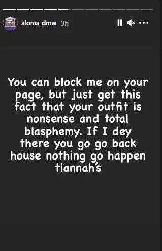 “If you block me on your page because I disagree with your outfit anuty Tiannah I’m begging to let that be the last time you disrespect our religion like that. Nobody dey fight for God ooo but never try that again and again if i dey that place yesterday aunty you go go back house nothing go happen”.
