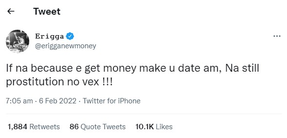 “If na because e get money make u date am, Na still prostitution no vex !!!” He tweeted.