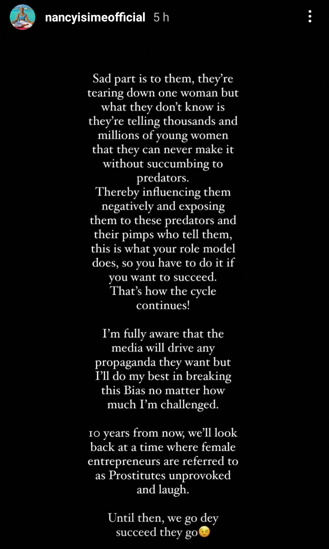 According to Nancy, any Nigerian woman who plans to be successful should be aware that she will be called a prostitute by society once she makes it.