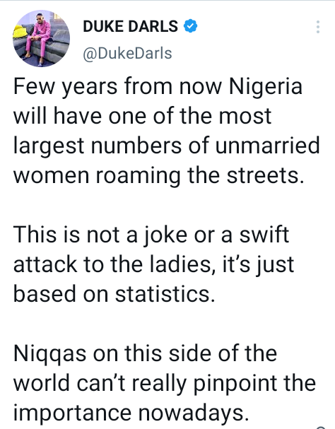 “Few years from now Nigeria will have one of the most largest numbers of unmarried women roaming the streets. This is not a joke or a swift attack to the ladies, it’s just based on statistics. Niqqas on this side of the world can’t really pinpoint the importance nowadays
