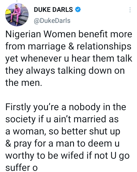 In a series of tweets on the microblogging platform, Twitter, Duke said Nigerian women should shut up and pray that men find them worthy to be considered wives otherwise they will suffer to avoid suffering.