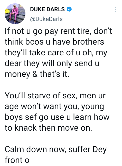 If not u go pay rent tire, don’t think bcos u have brothers they’ll take care of u oh, my dear they will only send u money & that’s it. You’ll starve of sex, men ur age won’t want you, young boys sef go use u learn how to knack then move on. Calm down now, suffer Dey front.”