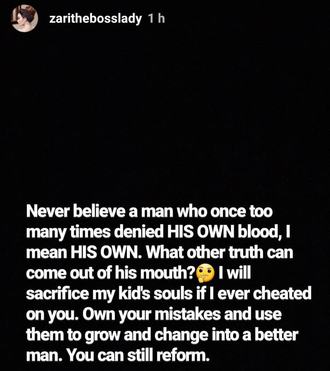 ”I will sacrifice my kids soul if I ever cheated on you. Own your mistakes and use them to grow and change into a better man. You can still reform” Zari wrote on her IG page.