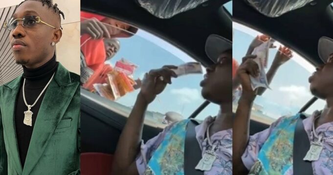 The singer was recorded in his car, in traffic, giving handouts to local beggars and road hawkers who came to meet him to beg for money. The rapper then began disbursing some Naira notes one at a time, but at some point, he stopped and asked that they go and hustle.