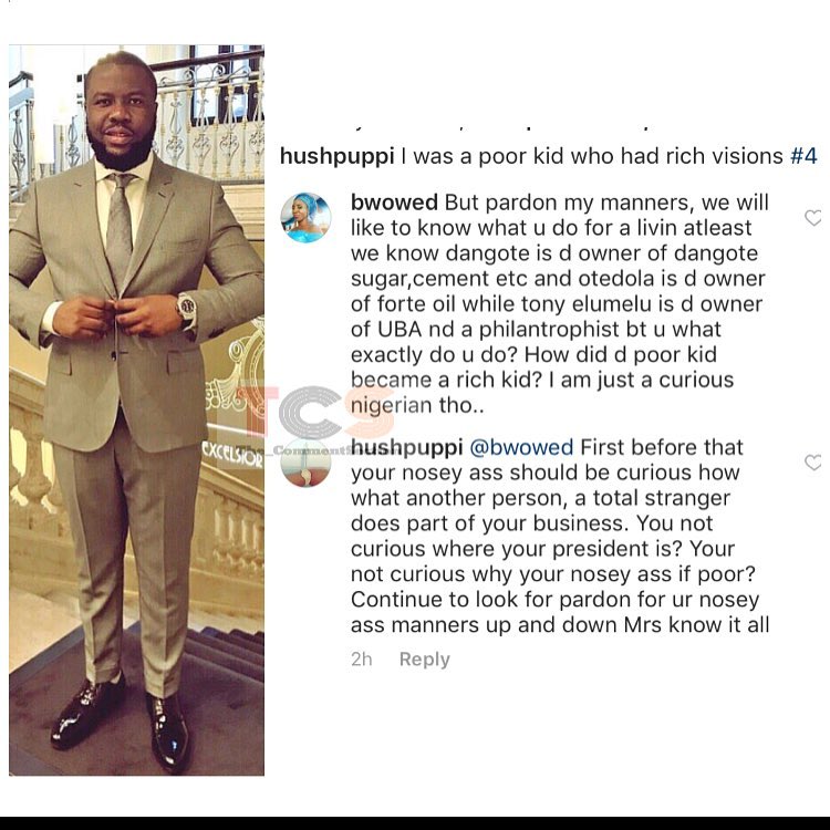 The female follower with the Instagram handle, @bwowed, isn’t impressed by Hush’s lavish lifestyle berated the socialite after he said “He was once a poor kid, who had rich visions”. She wrote: