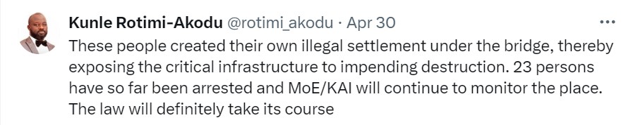 According to his tweets, the people who reside there have created their own illegal settlements under the bridge.